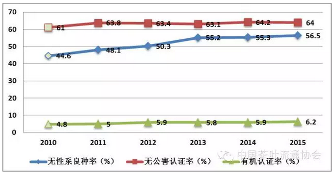 2、茶葉生產(chǎn)結(jié)構(gòu)不斷優(yōu)化,提質(zhì)增效明顯。“十二五”期間,我國低老茶園改造和品種改良成果顯著,茶園無性系良種率由“十一五”末的44.6%提升至56.5%。有機(jī)茶園、無公害茶園認(rèn)證率分別增長1和3個(gè)百分點(diǎn),呈現(xiàn)持續(xù)平穩(wěn)發(fā)展態(tài)勢(圖3)。